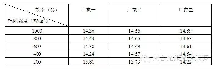 表1列出了國內三個組件廠家在第三方實驗室進行不同輻照強度下的效率測試結果,可以看到當輻照強度大于400W/m2時,組件的效率變化很小,在輻照強度為200W/m2時,組件的效率有比較明顯的下降。