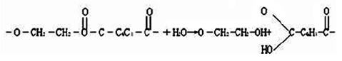 (2)水解 水解即縮合的逆反應(yīng)。纖維水解是由于水分子介入到纖維中而使高分子分解為二的反應(yīng),母體分子的一個(gè)部分從水分子中獲取了一個(gè)氫離子(H+),而另一個(gè)基團(tuán)則從水分子中聚集了羥基(OH-),使其分子鏈斷裂生成新的小分子物質(zhì)的過(guò)程。由于分子量變小,纖維抗拉強(qiáng)度減弱而損壞。所以縮聚型聚合體生產(chǎn)的合成纖維是不耐水解的。如常用的聚酯類(lèi)、聚丙烯、諾梅克斯等濾料很容易發(fā)生水解。聚酯類(lèi)纖維與諾美克斯纖維水解式如下: