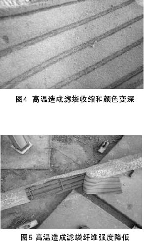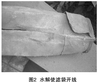 水解會(huì)破壞聚合物的主要結(jié)構(gòu),使纖維分子變小。煙氣中水分子含量和溫度越高,濾袋水解越嚴(yán)重。不同的濾料其水解溫度也不相同。其中P84是目前所用濾袋中抗水解性較差的一種,水解后,濾袋強(qiáng)度嚴(yán)重下降,易破損,縫紉線發(fā)生水解后,濾袋從縫紉線處開(kāi)裂,使濾袋不再是筒狀而成為一塊布(見(jiàn)圖2)。