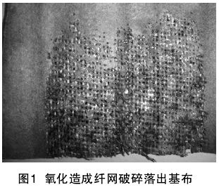 其分子主鏈由苯環(huán)在對(duì)位上連接硫原子而形成大分子主鍵,其結(jié)構(gòu)中至少有85%的硫醚鍵(-S-)是直接結(jié)合在兩個(gè)芳香族環(huán)之中。在高溫(150℃)條件下,即氧分子攻擊分子中的“-S-”鍵,并與之結(jié)合,生成SOx。使大分子鏈被擊碎,變成小分子結(jié)構(gòu)。由于苯環(huán)提供PPS纖維以剛性,而硫醚則提供PPS纖維以柔順性。因此,當(dāng)煙氣中的氧或氧化劑與PPS纖維中的-S-結(jié)合生成SOx,造成PPS纖維變色、變硬、變脆,強(qiáng)度降低而破損,嚴(yán)重時(shí)纖網(wǎng)會(huì)破碎而脫離基布(見(jiàn)圖1)