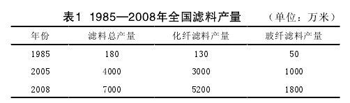 袋式除塵器至今已有百余年的歷史,其最大的優(yōu)點(diǎn)就是除塵效率可高達(dá)99.99%以上,排放濃度可達(dá)到10mg/m3以下,其分級(jí)效率也很高,對(duì)2.5μm以下的微細(xì)顆粒物也有很好的捕集效率,因此得到廣泛的應(yīng)用。袋式除塵器在其運(yùn)行的同時(shí),也會(huì)產(chǎn)生大量破損的廢、舊濾袋,但由于這些濾袋多數(shù)是合成化纖原料制造,生物降解性差,在自然界中難以被降解;又由于目前沒(méi)有有效的處置方法,隨意堆放后又成為了新的污染源。因此,如何有效處置破損的廢舊濾袋已成為當(dāng)前迫切需要解決的問(wèn)題。 1國(guó)內(nèi)濾袋市場(chǎng)現(xiàn)狀 國(guó)內(nèi)早期的袋式除塵器使用的濾袋為普通的工業(yè)機(jī)織布,個(gè)別高端應(yīng)用場(chǎng)合采用工業(yè)呢,1974年武漢冶金安全研究所研制了208工業(yè)滌綸布,得到了廣泛的應(yīng)用,直到現(xiàn)在仍有一些場(chǎng)合在使用。20世紀(jì)80年代初,東北大學(xué)與撫順第三毛紡廠共同研發(fā)了針刺氈非織造濾料,由傳統(tǒng)的織造濾料走向非織造濾料,實(shí)現(xiàn)了濾料革命性的轉(zhuǎn)變,開(kāi)始了濾料國(guó)產(chǎn)化的進(jìn)程。與織造濾料相比,非機(jī)織造濾料生產(chǎn)流程短、生產(chǎn)效率高、自動(dòng)化程度高、產(chǎn)品價(jià)格低,可廣泛應(yīng)用于各種除塵場(chǎng)合。 濾料的性能依賴于纖維的特性,在產(chǎn)生工藝變更的同時(shí),纖維的種類(lèi)也在快速發(fā)展。從早期的天然纖維、滌綸纖維、玻纖濾料,到NOMEX、PPS、PTFE等合成纖維,目前NOMEX、PPS、PTFE等纖維都已實(shí)現(xiàn)國(guó)產(chǎn)化,P84纖維、垃圾焚燒用同步除塵去除二英濾料也正在研制中。 在濾料品種不斷創(chuàng)新的同時(shí),濾料的產(chǎn)量也在飛速發(fā)展。1985—2008年國(guó)內(nèi)濾料產(chǎn)量情況見(jiàn)表1。
