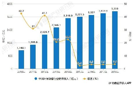 2010-2018年中國環(huán)保設(shè)備行業(yè)銷售收入統(tǒng)計及增長情況。數(shù)據(jù)來源:前瞻產(chǎn)業(yè)研究院整理