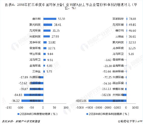 值得一提的是,這些上市公司主要分布在中國(guó)東部的幾個(gè)省,如江蘇省、浙江省、福建省、安徽省等,此外在北京、四川、河北等地也有少量分布。事實(shí)上,這也反映出中國(guó)環(huán)保設(shè)備行業(yè)內(nèi)企業(yè)較強(qiáng)的區(qū)域集中性,即國(guó)內(nèi)環(huán)保設(shè)備企業(yè)分布在地區(qū)經(jīng)濟(jì)較發(fā)達(dá)或者污染相對(duì)嚴(yán)重的地區(qū)。 2018年上市公司業(yè)績(jī)普遍下滑,維爾利業(yè)績(jī)?cè)鏊倭裂? 而從2018年前三季度環(huán)保設(shè)備行業(yè)上市公司的業(yè)績(jī)表現(xiàn)來(lái)看,15家上市公司業(yè)績(jī)同比普遍出現(xiàn)下滑,1/3的公司營(yíng)收下滑,過(guò)半的公司凈利潤(rùn)下滑,其中更有神霧環(huán)保、天翔環(huán)境、三維絲和盛運(yùn)環(huán)保的凈利潤(rùn)出現(xiàn)虧損。具體的,2018年前三季度,龍凈環(huán)保的營(yíng)收和凈利潤(rùn)規(guī)模依然領(lǐng)跑行業(yè),分別同比增長(zhǎng)了13.8%和12.25%,業(yè)績(jī)?cè)鲩L(zhǎng)依然穩(wěn)健;菲達(dá)環(huán)保和龍馬環(huán)衛(wèi)的營(yíng)收也仍然分別位居第二和第三;興源環(huán)境和聚光科技的營(yíng)收排名也基本保持穩(wěn)定;但是,神霧環(huán)保的營(yíng)收出現(xiàn)了明顯下滑,從2017年的排名第5直接下跌至了最后一名。