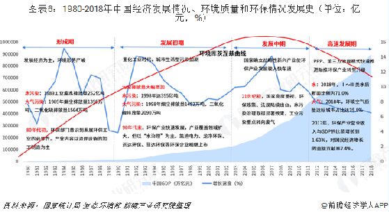 綜上,世界上的大多數(shù)國家在經(jīng)濟(jì)快速發(fā)展的過程中,都被環(huán)境污染問題所困擾,而且無一例外的都走了“先污染、后治理”的老路。環(huán)保產(chǎn)業(yè)進(jìn)入成熟和穩(wěn)定期都要伴隨著經(jīng)濟(jì)的波動、環(huán)境危害事件的催化、政府對環(huán)保的重視以及人民意識的提升。 中國環(huán)保設(shè)備產(chǎn)業(yè)發(fā)展現(xiàn)狀 中國環(huán)保產(chǎn)業(yè)發(fā)展歷程一覽:仍處于成長期 改革開發(fā)40年,伴隨著我國社會經(jīng)濟(jì)和生態(tài)環(huán)境保護(hù)事業(yè)的不斷發(fā)展壯大,中國環(huán)保產(chǎn)業(yè)從無到有,產(chǎn)業(yè)體系不斷完善,產(chǎn)業(yè)規(guī)模不斷擴(kuò)大,技術(shù)水平不斷提升,已經(jīng)成為國民經(jīng)濟(jì)的重要組成部分。結(jié)合我國經(jīng)濟(jì)發(fā)展水平和環(huán)境污染、治理情況描繪出我國環(huán)境庫茨涅茲曲線如下;目前,環(huán)境治理取得了很大的進(jìn)展,但仍有較多污染問題亟待解決,環(huán)保產(chǎn)業(yè)正處于高速發(fā)展期。 回顧我國環(huán)保產(chǎn)業(yè)的發(fā)展歷程可以將其分為四個階段:形成期、發(fā)展初期、發(fā)展中期和高速發(fā)展期。 第一階段:形成期(1990年前),這一階段以發(fā)展經(jīng)濟(jì)為主,環(huán)境形勢嚴(yán)峻。1972年6月聯(lián)合國在斯德哥爾摩召開第一次人類環(huán)境會以后,環(huán)境問題引起了我國高層決策者的重視。1973年8月,國務(wù)院頒布了我國第一個環(huán)境保護(hù)文件—《關(guān)于保護(hù)和改善環(huán)境的若干規(guī)定》;由此,我國環(huán)境保護(hù)事業(yè)開始起步。1988年,全國從事環(huán)保產(chǎn)品生產(chǎn)的企業(yè)1928個,實(shí)現(xiàn)工業(yè)銷售產(chǎn)值38億元,銷售利潤8.3億元。產(chǎn)業(yè)內(nèi)容以治理設(shè)備的加工制造為主,產(chǎn)品主要集中在“三廢”的末端治理和綜合利用。 第二階段:環(huán)保產(chǎn)業(yè)進(jìn)入發(fā)展初期(20世紀(jì)90年代)。我國進(jìn)入第一輪重化工業(yè)時代,城鎮(zhèn)化進(jìn)程加快,城市生活型污染加劇。伴隨經(jīng)濟(jì)粗放式快速推進(jìn),工業(yè)污染和生態(tài)破壞總體呈加劇趨勢,農(nóng)業(yè)面源污染問題凸顯,一些地區(qū)流域、區(qū)域環(huán)境污染和生態(tài)破壞已經(jīng)制約了經(jīng)濟(jì)社會可持續(xù)發(fā)展,甚至對公眾健康構(gòu)成威脅。產(chǎn)業(yè)范疇由以末端治理的設(shè)備制造為主,擴(kuò)展到覆蓋環(huán)保產(chǎn)品、環(huán)境服務(wù)、清潔技術(shù)產(chǎn)品、資源循環(huán)利用四大領(lǐng)域。1993-2000年的7年間,全國環(huán)保產(chǎn)業(yè)的從業(yè)單位數(shù)量由8651家增長到18144家,從業(yè)人員由188.2萬人增長到317.6萬人,營業(yè)收入總額由311.5億元增長到1689.9億元,年均增長約27%,利潤總額由40.9億元增長到166.7億元,年均增長約22%。 第三階段:環(huán)保產(chǎn)業(yè)進(jìn)入發(fā)展中期(21世紀(jì)初),經(jīng)濟(jì)發(fā)展與保護(hù)環(huán)境并重。這一階段,多項(xiàng)政策和規(guī)劃所制定的污染物總量控制制度帶動了污染治理及監(jiān)測技術(shù)裝備產(chǎn)業(yè)市場快速發(fā)展。2010年,“大力發(fā)展環(huán)保產(chǎn)業(yè)”首次寫入國民經(jīng)濟(jì)發(fā)展規(guī)劃中,環(huán)保產(chǎn)業(yè)地位被提升到前所未有的高度。 第四階段:環(huán)保產(chǎn)業(yè)進(jìn)入高速發(fā)展期(2012-至今)。一方面,環(huán)保產(chǎn)業(yè)的業(yè)務(wù)領(lǐng)域更加細(xì)化,覆蓋全產(chǎn)業(yè)鏈“預(yù)防——監(jiān)測——治理”,覆蓋水、大氣、土壤等多領(lǐng)域。另一方面,在政策的強(qiáng)力驅(qū)動下,PPP、第三方治理模式快速推進(jìn)助推環(huán)保產(chǎn)業(yè)轉(zhuǎn)型升級。截至2018年9月,財(cái)政部全國PPP綜合信息平臺項(xiàng)目管理庫共有生態(tài)建設(shè)和環(huán)境保護(hù)類項(xiàng)目796個,占PPP項(xiàng)目總數(shù)的9.6%,項(xiàng)目總投資額8733億元,占PPP項(xiàng)目總投資額的7.1%。