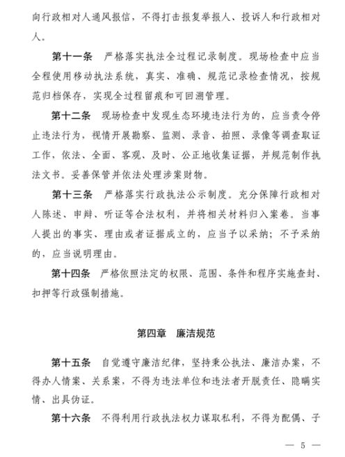 為進一步加強生態環境執法隊伍建設,促進嚴格、規范、公正、文明、廉潔執法,根據《中華人民共和國環境保護法》《中華人民共和國行政處罰法》及《生態環境行政處罰辦法》等法律法規規章,結合執法工作實際,我部修訂了《生態環境執法人員行為規范》,并經2023年第16次部常務會議審議通過。現印發給你們,請遵照執行。