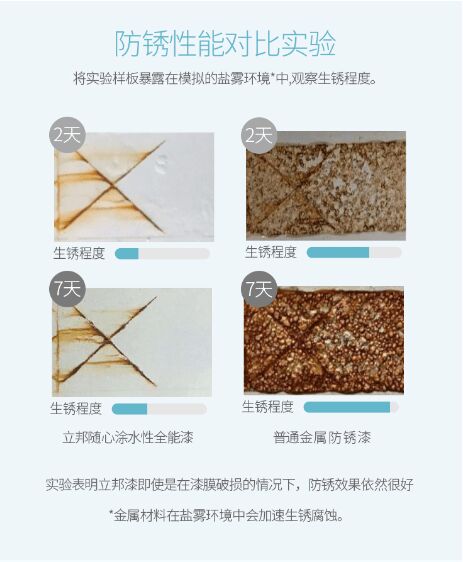 產(chǎn)品防銹性能對比實驗 此外,立邦隨心涂水性全能漆通過科學的水性化工藝制造而成,采用水性配方,VOC、甲醛釋放量等遠低于國家標準的要求,讓用戶可以在享受DIY的同時不用擔心健康問題。