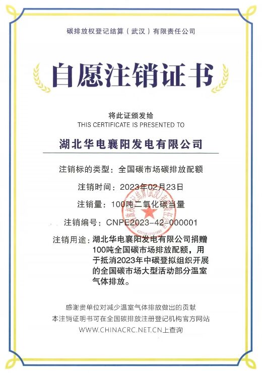 為貫徹習近平生態文明思想,響應國家雙碳目標,踐行中國華電綠色低碳高質量發展理念,實現大型活動碳中和,中國華電積極向中碳登捐贈碳配額,用于抵銷2023年中碳登組織開展的全國碳市場大型活動溫室氣體排放。襄陽公司自愿注銷100噸全國碳排放配額,碳資產公司現場提交自愿注銷申請,完成自愿注銷在線操作,并通過中碳登審核,收到中碳登頒發的“全國碳市場碳排放配額自愿注銷證書”,為全國大型活動實現“碳中和”做加法,彰顯“雙碳”目標的華電擔當和貢獻。