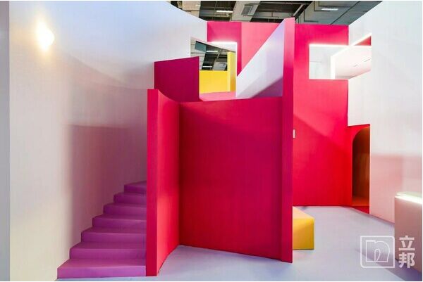 在設計主導的家居美學成為引導消費行為的當下,大家居產業正面臨生產銷售模式轉型升級的迫切需要。在此背景下,「設計盒子」產設融合館應運而生,以「共生」為主題,通過策展行為加速設計端和產業端融合進程,實現設計和產業共生發展。立邦亮相本次「設計盒子」產設融合館,以博爾赫斯筆下同名小說《小徑分岔的花園》為靈感,憑借豐富多元的色彩和質感,生動演繹花園所代表的多彩世界。展臺由兩個緊靠的圓形空間構成,通過中間網格交織的通道進行連接,借由不同色彩、不同質感的涂料將展覽空間切割出分區,營造出仿若甜品的馬卡龍色彩氛圍。參展觀眾在花園內自由的行走、分岔、休憩、再次相遇,感受時間和空間交織的神秘感。