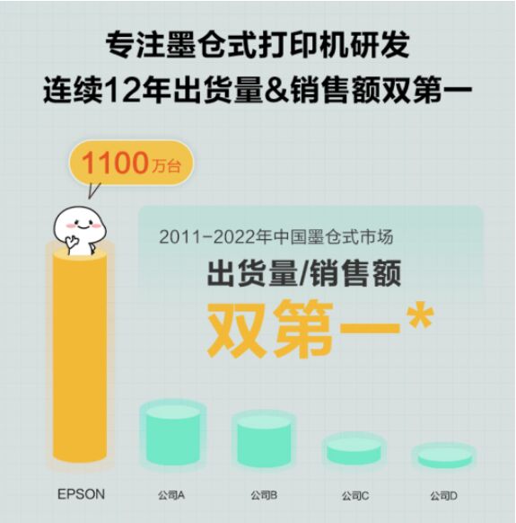 *1 以上數據來源于《IDC全球打印外設市場季度跟蹤報告》 (2022年第四季度)中國大陸地區墨倉式打印機品牌的調查,2011-2022年愛普生累計銷量1100萬臺。