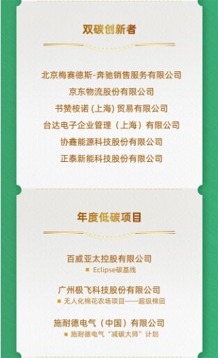 大道眾行遠。在踐行雙碳的道路上,需要各方力量共同參與,匯聚共識。本次雙碳行動者大會也對優秀的雙碳踐行者進行表彰,頒發了一系列年度雙碳行動者榮譽,包括雙碳行動力TOP10、雙碳創新者、年度低碳項目、年度低碳產品、年度低碳解決方案等,完整獲獎名單如下: