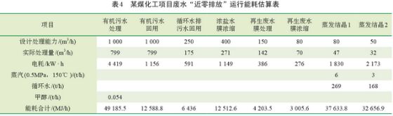 廢水“近零排放”運行成本高 煤化工項目廢水“近零排放”運行成本高,單位水處理直接成本高達11 元/t,全成本34 元/t,如表3所示,遠高于目前我國新鮮水價,這也是企業實施“近零排放”積極性不高的主要原因之一。 廢水“近零排放”運行能耗高 廢水“近零排放”系統能耗高。據統計,某煤化工項目水處理綜合能耗達153.7 MJ/t(折合5.2 kg標煤),是達標排放情景的6 ~ 10 倍,若采用自然蒸發模式可降低能耗45%左右,但仍然遠高于傳統的達標排放模式。某煤化工項目廢水“近零排放”系統運行能耗情況如表4 所示。 解決廢水“近零排放”經濟層面問題的主要建議包括:(1)提高水價。目前企業所用工業用水成本為5 ~ 10 元/t,企業實行“近零排放”沒有積極性。(2)提高排污費。(3)提高違法成本。只有當違法成本高于守法成本、企業新鮮水使用成本高于廢水處理回用成本時,才能觸動排污者的切身利益,使廢水處理與回用變為自覺行動,減少廢水排放。(4)政府加快出臺相關政策措施。 管理層面 對廢水進行分類收集、分質處理與分段回用 根據煤化工項目廢水排放情況,建議將廢水“近零排放”系統至少分為循環排污水回用、化學水排水回用、有機廢水處理及回用、濃鹽水處理和蒸發結晶等5 個工序。 重視“近零排放”全系統流程的優化銜接 煤化工廢水“近零排放”是一項復雜的系統工程,涉及幾十項水處理技術,其中包括多項目前最先進的技術,因此在運行過程中要重視全系統流程的優化和銜接,特別要重視水量動態平衡、各工段的有機銜接和物料平衡,特別是鹽平衡。 加強“近零排放”設施運行過程的管理 煤化工廢水“近零排放”的運行管理也非常重要,包括加強對進入自然蒸發設施的廢水的水質控制、重視專業人才的培養與引進和制定完善的應急措施等。 風險層面 蒸發結晶鹽的二次污染風險 蒸發結晶鹽的主要成分為鈉、鉀氯化物,富集有機物及少量的重金屬物質。重金屬含量是影響結晶鹽性質的主要因素。其主要來源為原水的濃縮富集及煤氣化過程的帶入。由于結晶鹽中污染物的組成與煤質、原水水質有關,不能簡單地將煤化工“近零排放”系統排放的結晶鹽都定性為危險廢物。考慮結晶鹽極易溶于水,容易造成二次污染,且不同批次原料煤煤質組成差異較大,造成結晶鹽組成差異大。從環境風險的角度考慮,在煤化工項目前期工作中,建議將蒸發結晶鹽暫按危險廢物考慮,在項目實際生產過程中根據結晶鹽的分析鑒定結果最終定性。 系統池體的地下水污染風險 在煤化工廢水“近零排放”系統中,自然蒸發設施、廢水暫存池、污水處理池等各種池體占地面積大,污染地下水的風險也很大,應重點防控。 防止地下水污染的主要對策建議包括:(1)自然蒸發設施、廢水暫存池等建設嚴格按照《危險廢物填埋污染控制標準》進行設計,綜合防滲系數達到或小于1.0×10-12 cm/s,并充分考慮防凍漲措施。(2)根據地下水流場情況,布置地下水監測點,并制定周密的應急計劃和監測方案。 自然蒸發設施的大氣污染風險 濃鹽水在自然蒸發過程中,會出現有機污染物擴散到空氣中,以及結晶鹽顆粒隨風飄散的現象,為避免對人體健康及生產裝置產生影響,自然蒸發設施在選址及建設時應充分考慮安全距離問題,采取防護措施。