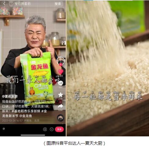 在短視頻直播的內容生態中,美食類達人握著絕對流量密碼。達人們多用幽默的對話+生活化的烹飪場景+簡單易操作的美食教程,讓產品恰到好處的“穿插”其中,從而帶來宣傳引流的效果。金龍魚邀請有著“中國藥膳大師”之稱的夏天大廚為其背書宣傳,通過“在家如何做出簡單又美味的排骨燜飯”作為此次視頻的宣發切入點,在食物選材上向大家推薦金龍魚清香稻長粒香米,并通過視頻畫面和對話文字,展示出“Q彈好嚼勁”的產品特性和優越的生態基地種植環境,來喚起消費者購買欲。