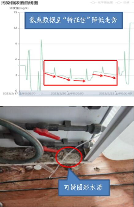 2月24日,調查組對該公司開展現場檢查,經檢查自動監測設備,發現從2月23日21:00左右起,氨氮自動監測濃度數據由達標急速變化至超標,疑似人為調整自動監測設備運行狀態,且氨氮自動監測設備后方采樣管線附近存在一處“圓形水漬”,疑似長時間放置“水瓶”所致。經調取門崗視頻監控,發現23日當晚有車輛進出廠區,與數據異常時段吻合。調查組立即啟動與公安部門聯合辦案機制,公安部門提前介入,經調閱被查扣車輛行車記錄儀,獲取如下通話記錄信息:“老許(總經理)打電話了,讓測實數,把瓶撤了……”經查實,該公司因擔心出水超標,采用調配合格的水樣裝入水瓶代替實際水樣進行檢測,篡改COD、氨氮等污染物自動監測數據,并通過超越管線將泥水混合物通過污水排放口排入河道長達40分鐘,最終導致下游國考斷面水質超標報警。