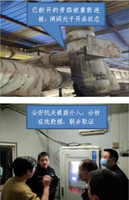 宜昌市生態環境局立即行動,成立執法專班,并提請公安機關提前介入、聯合辦案,采取“四不兩直”方式奔赴現場。現場檢查發現,該公司將原本在生態環境部門管理要求下已經切斷的旁路管線重新封包恢復使用,并非法設置三通閘閥,在瓦線生產線干燥及燒成工段的窯爐排氣管道上形成旁路,旁路盲板處于開啟狀態,通往脫硫塔的盲板處于關閉狀態,旁路廢氣繞過自動監測設施直接排放至廠房頂部外環境。生態環境監測人員對該公司瓦線窯爐旁路廢氣排放情況開展監測,根據現場手工監測結果和同一時間段該公司煙氣脫硫塔在線監測結果對比分析,設置旁路后排放的二氧化硫、氮氧化物等未經處理,繞過自動監控設施監控,排放濃度差異大,監測數據失真,涉嫌通過“旁路排放,逃避自動監控設施”篡改監測數據。