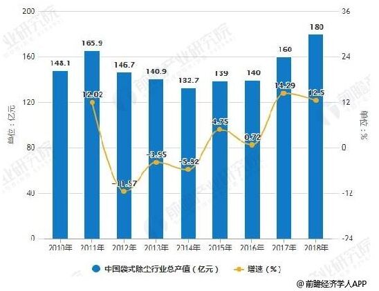 2010-2018年中國袋式除塵行業總產值統計及增長情況預測