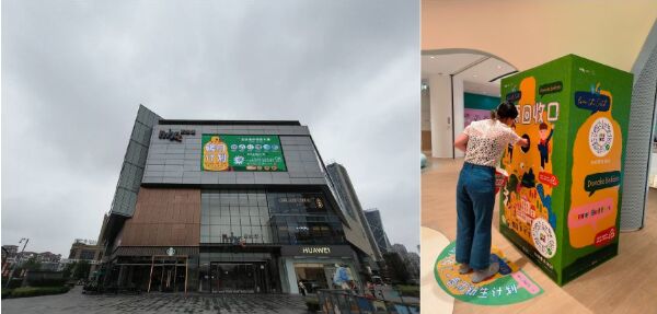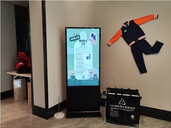 商場內外電子大屏、商場內水牌、線上小程序都大大地突出了春雨新生的回收塑料瓶做校服的主題傳播。