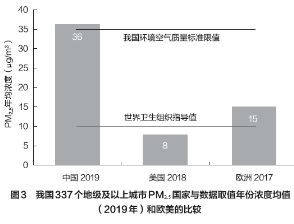 1.3 與發達國家的差距 國際社會在大氣環境管理中也往往將PM2.5和O3作為關注的重點。經過多年努力,我國PM2.5濃度雖然大幅降低,但是與發達國家相比,差距仍然明顯。2019年我國環境空氣中PM2.5濃度大致是歐美當前水平的2.5~4.5倍,是世界衛生組織基于健康影響的準則值的3.6倍(圖3)。O3濃度水平比美國高30%左右,大致相當于美國20世紀80~90年代水平,是世界衛生組織基于健康影響的準則值的1.5倍。因此,我國PM2.5和O3的污染防治和保護人體健康的需求差距依然巨大,在相當長的時間里,我國還需要致力于削減相關污染物的排放量,持續大幅度降低PM2.5濃度,盡快遏止O3濃度上升勢頭并推動其濃度下降,保護人民群眾身體健康。