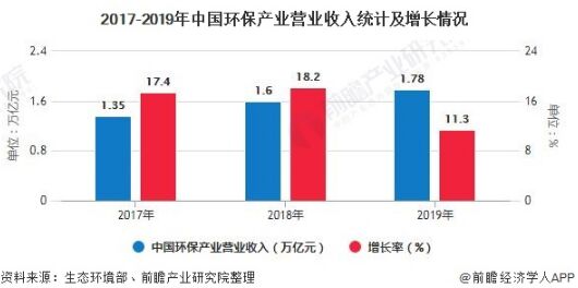 2019年中國環保行業營業收入將近1.8萬億元 2019年全國環保產業營業收入約1.78萬億元,同比增長11.3%,遠高于同期經濟增速;“2020中國環境企業50強”榜單中,有9家公司營收過百億。這是記者近日從全國工商聯環境商會主辦的“2020中國生態環境產業高峰論壇”上獲悉的一組數據。 在成都舉行的這次論壇上,與會專家表示,在當前加快構建“雙循環”新發展格局的宏觀背景下,環保產業的高質量發展將迎來重大機遇。據了解,從部委到地方政府,再到企業,都在圍繞環保產業新一輪發展蓄勢加力。生態環境部將加大資金投入,會同有關部門出臺和落實生態環境保護相關的財稅、價格、金融、貿易等優惠扶持政策。 1、中國環保產業市場空間加速釋放 “大力發展環保產業,是堅決打贏污染防治攻堅戰的重要舉措之一。隨著生態環境保護治理的力度持續加大,我國環保產業發展的市場空間加速釋放,在國民經濟中的戰略地位不斷提升。”生態環境部副部長莊國泰在論壇上說,在發展規模方面,2019年全國環保產業營業收入約1.78萬億元,同比增長11.3%,遠高于同期經濟增速;其中環境服務業的營業收入約1.12萬億元,同比增長23.2%。