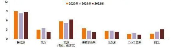 對(duì)比2021和2020年情況,2022年P(guān)M2.5主要污染源總體呈下降趨勢(shì)。與2021年相比,燃煤源、工業(yè)工藝源、生物質(zhì)燃燒源和自然源分別下降36.0%、31.5%、17.9%和12.9%;與2020年相比,生物質(zhì)燃燒源、燃煤源、工業(yè)工藝源、自然源和移動(dòng)源分別下降36.4%、23.9%、14.6%、10.4%和3.2%。