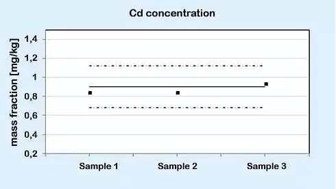 圖4.檢測到的鎘濃度(直線:標準值;點化線:DINEN14902標準規(guī)定的上下限。)