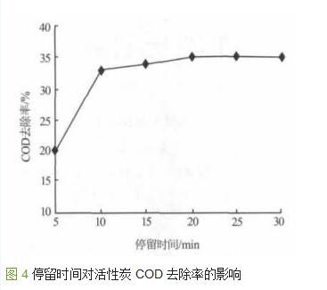 從圖3可以看出,隨著臭氧投加量的增加,COD去除率逐漸上升;當臭氧投加質量濃度達到5mg/L時,COD去除率達到最大(10%左右);隨著臭氧投加量的增加,COD去除率不再有明顯的變化,為了節約成本,選擇5mg/L為臭氧直接氧化去除COD的最大投加質量濃度。 2.2.3 pH 試驗研究中,以混凝氣浮處理后的化工外排污水為試驗用水,在室溫、臭氧氧化接觸時間為10min、臭氧投加質量濃度為5mg/L的操作條件下,考察不同pH情況下臭氧氧化去除COD的效果。試驗研究發現,堿性條件下臭氧去除COD的效果較好,在pH為7~9范圍內較佳,而本實驗用水pH為7~8,因此可不調pH。 2.2.4 效果評價 在確定了臭氧與污水接觸時間、臭氧投加質量濃度和pH等主要影響因素后,以混凝氣浮處理后的化工外排污水為試驗用水,評價了臭氧氧化處理效果,共進行了7個批次的COD評價試驗,每個批次處理水量150L,每處理50L取樣分析1次,COD去除率為每個批次平均值,結果表明,在最佳操作條件下,臭氧氧化處理化工外排污水,COD去除率均<10%,出水尚不能達到穩定排放的標準。 2.3 活性炭吸附 當污水流經活性炭表面時,可將溶解或懸浮在污水中的有機和無機污染物吸附到活性炭顆粒內,達到凈化污水的效果。 2.3.1 活性炭選型 活性炭顆粒越小,過濾面積就越大。粉末狀的活性炭總面積最大,吸附效果最佳,但粉末狀的活性炭很容易隨水流出,難以控制。粒狀的活性炭因顆粒成形不易流動,水中有機物等雜質在活性炭過濾層中也不易阻塞,其吸附能力強。試驗選擇粒徑為1~2mm的粒狀活性炭為去除化工外排污水中COD的最佳填料。 2.3.2 停留時間 將混凝氣浮處理后的化工外排污水以不同流速流經活性炭柱,考察停留時間對活性炭去除COD效果的影響,結果見圖4。