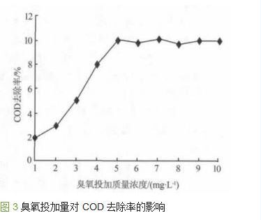 從圖2可以看出,臭氧與污水充分接觸10min后COD去除率約10%,達到最佳去除效果,故確定臭氧氧化最佳接觸時間為10min。 2.2.2 臭氧投加量 以混凝氣浮處理后的化工外排污水為試驗用水,在室溫、臭氧氧化接觸時間為10min的條件下,考察了臭氧投加量對COD去除率的影響,結果見圖3。