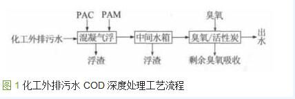 由表1可知,經水解酸化—A/O工藝處理后的化工外排污水中BOD、氨氮、石油類和pH均能穩定達到一級排放標準。但SS為20~40mg/L,COD為60~100mg/L,無法穩定達到一級排放標準。 1.2 檢測方法 pH:電極法;COD:重鉻酸鉀法;氨氮:納氏試劑法;BOD5:稀釋接種法及BOD儀分析法;石油類:CCl4萃取及紅外分光光度法;SS:重量法。 1.3 試驗設備和材料 主要設備:高頻臭氧機1套,濟南天健科技發展有限公司生產,臭氧最大產量50g/h;臭氧氧化氣水混合系統1套,濟南天健科技發展有限公司生產,處理量12t/h;臭氧活性炭處理裝置1套,自制,處理量30L/h,材質為有機玻璃,尺寸為D0.2m×1.5m;計量泵1臺,漢勝工業設備有限公司生產,最大流量100L/h;充氧泵1臺,創星電器有限公司生產,充氣量3L/min;混凝氣浮裝置1套,自制,處理量4t/h,材質為不銹鋼,尺寸為2.2m×1.2m×1.9m。 主要藥劑:聚合氯化鋁(PAC),固體,氧化鋁(Al2O3)的質量分數在27%~29%,鹽基度在40%~90%,河南省鞏義市玉林凈水材料有限公司生產;陰離子聚丙烯酰胺(PAM),固體,相對分子質量600萬~1800萬,河南省鞏義市玉林凈水材料有限公司生產;杏殼活性炭,粒徑約1~2mm,蘭州先華科技發展有限公司生產。 1.4 工藝流程 針對蘭州石化分公司化工污水處理場生化單元二沉池污泥沉降能力較差,處理后的外排水SS和膠體含量較高,加上難生化降解的有機物較多等特點,經過大量探索試驗研究,開發出了一套混凝氣浮—臭氧/活性炭組合工藝深度去除COD的技術。在該工藝中,原水先經過混凝氣浮單元去除懸浮態有機物和膠體有機物,然后通過射流器按一定比例和臭氧充分混合,再自下而上流經活性炭柱,通過活性炭的吸附和臭氧/活性炭的催化協同作用,將難生化降解的有機物去除,實現化工外排污水深度處理的目的圖1所示。