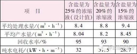 1.2 高含鹽水溶液的沸點溫升 溶液的沸點高于純溶劑的沸點,這一現象稱為溶液的沸點溫升,沸點溫升是用于確定裝置蒸發溫度的重要數據。根據燃煤鍋爐進水水質全分析結果配置得到各種濃度飽和溶液的水樣,常壓下測定不同飽和溶液的沸點溫升、溶液的含鹽量,得出燃煤注汽鍋爐排放的高含鹽水的沸點升高為5.5 ℃。 1.3 工藝流程 經分析后確定采用單級蒸汽機械再壓縮+強制循環蒸發結晶工藝處理油田循環流化床鍋爐排濃鹽水。設計試驗進水規模為240 m3/d,處理能力為10 m3/h,總投資為2 970萬元,主要設備除壓縮機為GE公司外,其余全為國產設備。 1.4 主要技術參數 進料溫度:80~90 ℃;蒸發量:9.7 t/h;新蒸汽用量:0.712 t/h,158 ℃;閃蒸二次蒸汽溫度:101 ℃;壓縮后二次蒸汽溫度:111 ℃;離心機濾餅附液率:5%;冷卻水用量:8 m3/h,水溫≤20 ℃。 2 裝置運行與分析 2.1 MVR運行情況 ① 不同含鹽量濃縮水的處理情況 為分析MVR運行情況,考察了含鹽量分別為15%、20%及25%的濃縮水處理情況。其中循環流化床鍋爐排放高含鹽水(原液)、MVR濃縮水及MVR冷凝水分別呈現棕黃色、黑色、透明。水質分析結果表明,MVR濃縮水是高堿度、高氯根、高COD、高二氧化硅及高礦化度水型,具有較強腐蝕性,含油量>15 mg/L、COD>14 000 mg/L,超過國家二級排放標準不能外排;MVR冷凝水是離子含量較低的弱酸性純凈水,滿足《稠油注汽系統設計規范》(SY/T 0027—2007)中規定的熱采鍋爐給水的水質指標,對于《工業鍋爐水質》(GB/T 1576—2008)只有pH值指標需要微調,另外COD指標接近國家二級排放指標,可能是水中易揮發有機物冷凝所致。 ② 運行指標及成本 產生不同含鹽量的濃縮液運行電耗見表2。