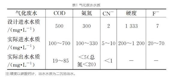 煤化工企業排水中氣化廢水處理難度高,水質波動大。氣化廢水通常具有高硬度、高氨氮、難降解、部分水質存在不可預見性的特點。煤氣化工藝及裝置操作穩定性對氣化廢水水質影響較大,某項目氣化裝置正常運行時氣化廢水水質為氨氮150~400 mg/L,COD 400~900 mg/L,氣化裝置事故工況時氣化廢水COD可達3 000mg/L,氨氮可達1 000mg/L,水質波動可持續近一個月時間。氣化廢水水質與氣化工藝、進料煤質、配煤方案、操作運行關系較大。設計階段氣化廢水水質由氣化裝置工藝專業通過設計煤種模擬計算,結合設計煤種試燒數據給出,項目運行后受煤炭供應影響,運行煤種配煤方案通常與設計煤種存在差異,即便氣化裝置操作正常,氣化廢水實際水質與設計水質相比仍存在一定的差異。煤種組合的變化及氣化裝置操作運行的變化會使氣化廢水水質波動較大。