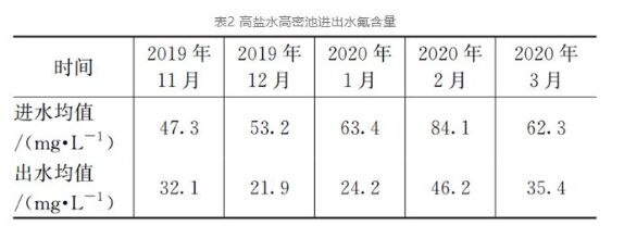從實際運行數據可以看出,僅管氣化廢水水質波動較大,但COD和氨氮處理效果相對較好,處理后出水氨氮最低可小于1mg/L。實際來水CN-和F-高于設計值,硬度低于設計值,這3個指標的變化均與煤種和配煤方案有較大的關系。CN-的生成與氣化溫度有關,中安氣化爐為粉煤氣化屬于高溫氣化工藝,氣化溫度>1 500℃,碳和氮在高溫下易發生反應,生成CN-。氣化污水CN-雖高于設計值,但小于10mg/L,如在進生化前采用氧化破氰預處理,氧化劑投加后不一定作用于氰根離子,大概率會與有機污染物反應。考慮到氰根離子未超過10mg/L,項目組采用提高生化系統氰根耐受性的方式處理氰根,通過逐步提高生化池進水CN-,適當加大生化池污泥回流量和硝化液回流量的方法馴化污泥,逐步提高系統對CN-的耐受性,經過近3個月的馴化,二沉池出水CN-可穩定小于0.5mg/L。氣化廢水中的F-主要與煤里氟的含量有關,由于運行煤種的變化造成F-來水超標,F-對蒸發結晶系統中的鈦材有一定的腐蝕性,考慮到中安廢水處理流程中并未設置單獨除F-設施,且由于現場占地緊張,無法新增除氟設施,只能利用現有除硬、除硅設施同步除氟。除氟、除硬、除硅的協同處理首先通過兩家研究單位實驗室研究反應機理,再通過現場調整操作運行解決。除氟、除硬、除硅最適宜的反應條件及pH均不同,通過實驗室和現場測定,適當調整反應pH、加藥量對除氟有一定的協同去除效應。現場根據研究結論摸索、調整運行操作,利用現有高鹽水除硬、除硅設施可同步達到30%~50%的除氟效率。系統中氟離子未完全去除,各段出水常年保有一定的氟離子含量,項目運行近2年來,后續蒸發結晶系統材料并未出現大面積腐蝕,在整個近零排放系統中F-的腐蝕性可控,見表2。
