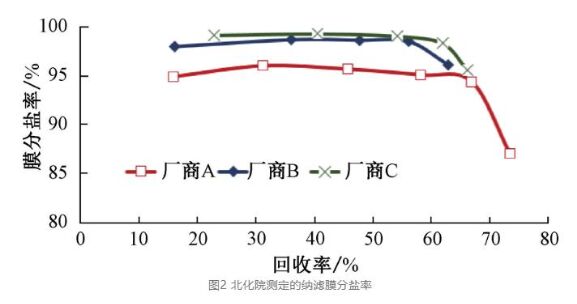 納濾膜最初開發目的并非分離一、二價離子,對納濾膜的篩選顯得至關重要,通過研究單位對市面上主流廠商的納濾膜做了實驗室標定,證明主流廠商納濾膜在實驗室條件下均可實現一、二價離子的有效分離(見圖2)。項目實際運行后納濾膜對一、二價離子進行了有效地分離,同時屏蔽了淮河水水質波動可能造成的離子變化,濃水側以硫酸根離子為主,產水側以氯離子為主,濃淡水側硫酸根與氯離子比值均相差數量級,為后續蒸發結晶單元提供了較穩定的進料。