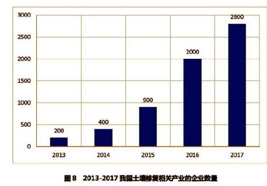 2013-2017我國土壤修復相關產業的企業數量。資料來源:土壤修復行業2018年度發展報告