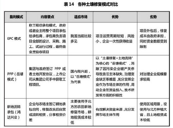 中國環聯介紹,EPC模式在我國目前比較多見,項目運營周期較短,風險小,企業一次性獲得收益。但項目外包后,修復成本由政府承擔,同時資金數額受到限制,而PPP模式則對治理企業規模要求較高。 中國環境保護產業協會土壤與地下水修復專業委員會將目前的土壤修復模式概括為三種:污染方付費模式、受益方付費模式和財政直接出資模式。 該委員會表示,隨著政策的不斷完善、技術的持續升級以及修復標準的逐步細化,行業壁壘將明顯提升,預計未來企業數量增速將放緩,先期進入土壤修復行業的龍頭企業具備更強的競爭力,一些在細分領域專業性強的技術企業也將脫穎而出。