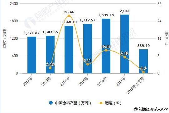 涂料行業總體產量呈持續上升態勢 近年來,由于供給側改革、營改增的推進,涂料行業經歷了史上最嚴重的洗牌;環保政策趨嚴更是使得大部分中小企業舉步維艱,各地陸續出現涂料企業停產、倒閉現象。然而,在中小企業的數量與產能都在減少的同時,大中型企業卻供不應求,各大外資企業相繼在全國各地擴建投產或選擇OEM代工;市場競爭開始轉向良性發展,從而使得行業總體產量呈持續上升態勢。 2018年上半年中國涂料行業發展外部環境分析 2018年上半年國內生產總值418961億元,按可比價格計算同比增長6.8%。分產業看,第一產業增加值22087億元,同比增長3.2%;第二產業增加值169299億元,增長6.1%;第三產業增加值227576億元,增長7.6%。 2018年1-6月份,全國規模以上工業企業實現主營業務收入52.1萬億元,同比增長9.9%;發生主營業務成本44萬億元,增長9.5%;主營業務收入利潤率為6.51%,同比提高0.41個百分點。規模以上工業企業實現利潤總額33882.1億元,同比增長17.2%。 涂料產量首次突破2000萬噸 據前瞻產業研究院發布的《涂料行業市場需求預測與投資戰略規劃分析報告》統計數據顯示,2017年中國涂料產量達到2041萬噸,首次突破2000萬噸大關。值得注意的是,中國涂料產量增速正逐漸放緩。截止到2018年上半年全國規模以上企業涂料產量累計839.49萬噸,同比增長了0.6%。1-6月累計產量排在前3位省市的分別是:廣東176.47萬噸,同比降低4.9%。上海98.44萬噸,同比降低12.1%。江蘇97.27萬噸,同比降低2.0%。