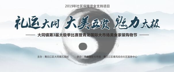 禮運大同 大美五賢 魅力太極 大同鎮第3屆太極拳比賽暨青龍國際大市場美食家裝購物節 7年前,青龍國際大市場積極響應政府“北改”號召從北三環搬遷到了青白江。7年以來青龍國際大市場得到了上級部門的關心與支持,獲得了長足的發展,憑借成熟的運營,良好的口碑,在區域內取得了巨大的影響,這也奠定了青龍國際大市場與上級部門長期友好的合作關系。 青龍國際大市場始終堅持回饋社會,積極投身區域經濟文化建設。結合市場自身特點,在7周年慶典活動當天,承辦了由上級部門主辦的“禮運大同 大美五賢 魅力太極 大同鎮第3屆太極拳比賽暨青龍國際大市場美食家裝購物節”活動。